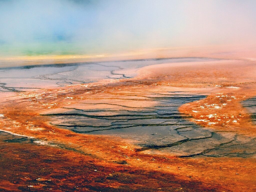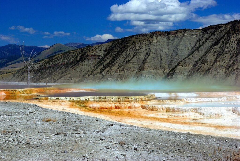 At Mammoth Hot Springs, you’ll find unique formations made of minerals. Hot water from deep underground rises to the surface and leaves behind deposits of limestone. These deposits create beautiful terraces that look like cascading steps. The colors range from bright white to shades of orange and brown, making it a sight you won’t forget.